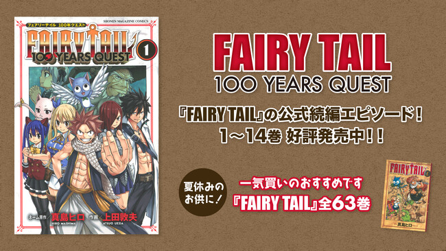 「FAIRY TAIL」「EDENS ZERO」などで知られる、真島ヒロの新作「FAIRY TAIL 100 YEARS QUEST」((ネーム原作・真島ヒロ/作画・上田敦夫)最新第15巻が8月8日発売予定!これを記念して、講談社が運営するYouTubeチャンネル「フル☆アニメTV」にて、TVアニメ「FAIRY TAIL」1期1~41話を無料配信いたします。本日7月14日から8月13日までの期間限定配信となりますので、新作と一緒にぜひお楽しみください!