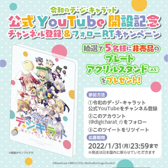 令和のデ・ジ・キャラット公式YouTube(https://www.youtube.com/channel/UCyh3dY8zrFmYwvBZL8gkhVA)をチャンネル登録し、令和のデ・ジ・キャラット公式Twitter(https://twitter.com/digicharat_r)をフォローのうえ、指定のツイートをリツイートしてください。
