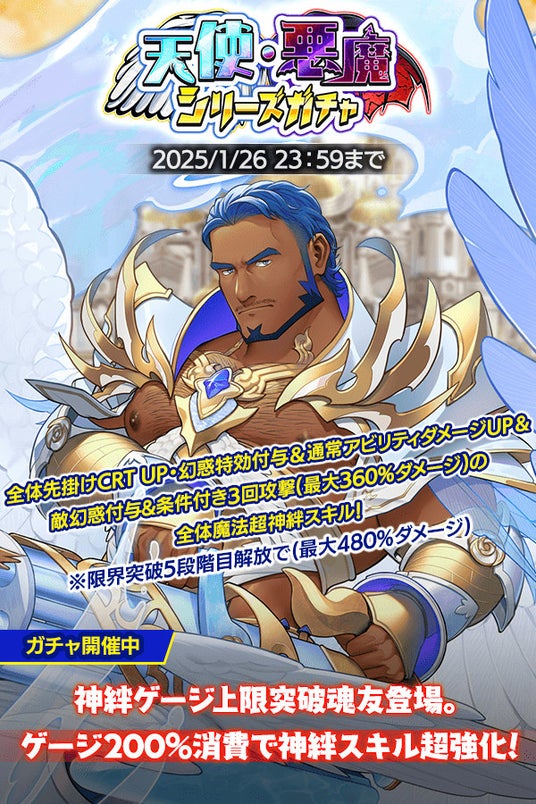 今回は「ゼギドエル」が登場します。本ガチャでは、過去の天使・悪魔シリーズガチャに登場した「ゴルード」「セルバート」「アイシュエル」「ダンタリオン」「フォカロル」「ヴァレフォル」「ニトハイヤ・グラシャラ」「ミズィヴエル」も入手可能です。いずれも神絆ゲージ上限突破スキルを持つ強力な魂友なのでお見逃しなく!