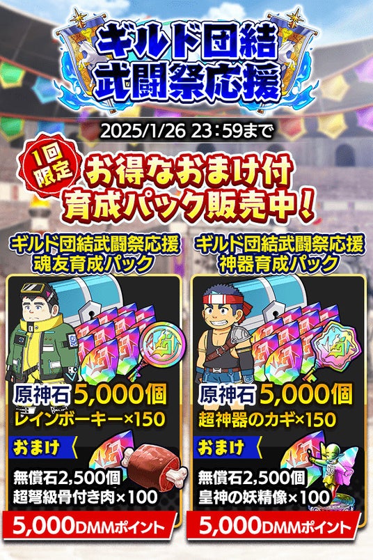 さらに、レインボーキーや超神器のカギがセットになった「ギルド団結武闘祭応援育成パック」も2種登場!おトクに原神石を購入できるチャンスですのでお見逃しなく。