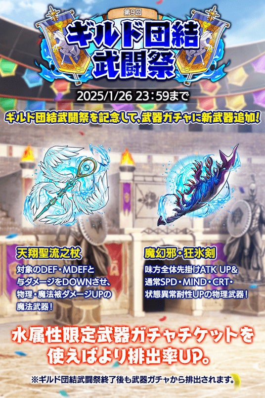 また、武器ガチャに「魔幻邪・狂氷剣」「天翔聖流之杖」の2種が追加!イベント報酬の水属性限定武器ガチャチケットでも入手可能ですので、ぜひイベントに挑戦してみてください。