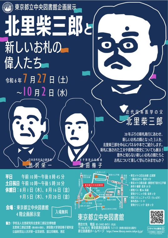 令和6年(2024)7月3日に20年ぶりに新札が発行されました。それにあわせ、北里柴三郎を中心に津田梅子、渋沢栄一という新しいお札の顔3人の業績や生涯について御紹介します。あわせて、新札に施された工夫や貨幣の歴史についても展示します。博物館などの協力のもと作成したパネルを展示し、200冊を超える本が並びます。体験コーナーもありますので、小学生や中学生の夏休みの自由研究や探究学習にも是非御活用ください。