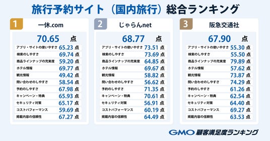 GMOインターネットグループのGMOリサーチ&AI株式会社(代表取締役:荻田 剛大)は、同社が運営する「GMO顧客満足度ランキング」における「旅行予約サイト(国内旅行)」(※1)カテゴリのランキング結果を2026年2月25日(水)に公開しました。各サービス利用者が本当に満足している国内旅行の旅行予約サイトを明らかにする、同カテゴリの総合ランキングでは、一休.comが1位に輝きました。