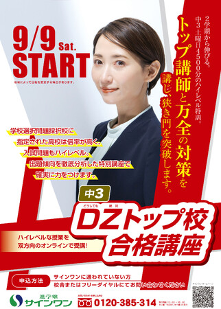 株式会社 学研ホールディングス(東京・品川/代表取締役社長:宮原博昭)のグループ会社、株式会社 学研スタディエ(さいたま市/代表取締役社長:亀谷眞宏)の展開する、埼玉県の進学塾サインワンでは、令和5年9月9日より、県内トップ校合格を目指す中3生対象の「DZトップ校合格講座」を実施します。