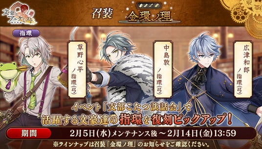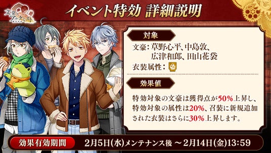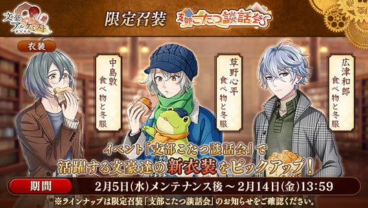 さらに、イベントと同時に開催される限定召装『支部こたつ談話会』にて新規追加された「草野心平」「中島敦」「広津和郎」の〈食べ物と冬服〉を編成すると、得点の獲得率がそれぞれ30%上昇します。