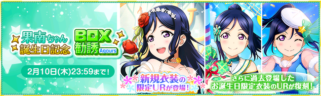 株式会社ブシロード(本社:東京都中野区、代表取締役社長:橋本義賢)は、KLab株式会社(本社:東京都港区、代表取締役社長:森田英克)と共同開発いたしましたスマートフォン向けアプリ『ラブライブ!スクールアイドルフェスティバル』(以下、スクフェス) においてAqours松浦果南誕生日記念キャンペーンの開催をお知らせいたします。是非貴社の媒体にてお取り扱い頂きますようお願い申し上げます。