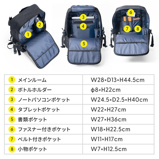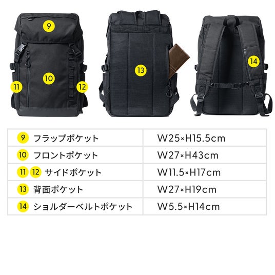メイン収納部は24Lでたっぷり収納することができます。13個のポケットを備えているので、ノートPCやタブレット、書類、小物類をすっきり整理できます。ノートPCは15.3インチ、タブレットは11インチまで収納可能で、ボトルホルダーやショルダーベルトのポケットもあり、取り出しやすさも抜群です。