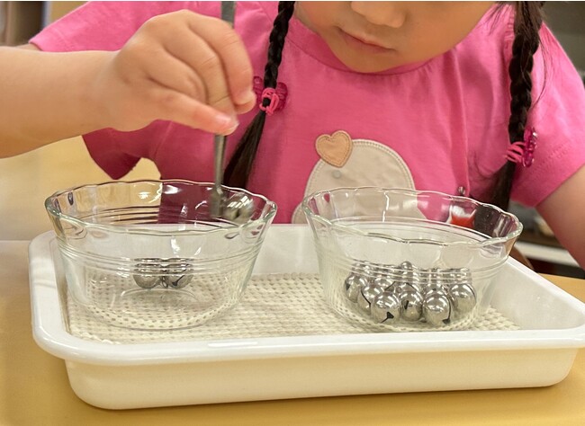 内容は、モンテッソーリ教育の柱である「日常生活の練習」「感覚教育」「言語教育」「算数教育」「文化教育」の環境の中から、お子さまの興味ある分野を選択して活動していただきます。