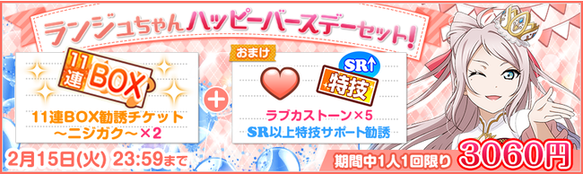株式会社ブシロード(本社:東京都中野区、代表取締役社長:橋本義賢)は、KLab株式会社(本社:東京都港区、代表取締役社長:森田英克)と共同開発いたしましたスマートフォン向けアプリ『ラブライブ!スクールアイドルフェスティバル』(以下、スクフェス) において、虹ヶ咲学園スクールアイドル同好会鐘 嵐珠誕生日記念キャンペーンの開催をお知らせいたします。是非貴社の媒体にてお取り扱い頂きますようお願い申し上げます。
