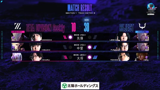 TEAM MATCH 3は昨シーズンの獲得ポイントランキングトップ選手を擁する「ZETA DIVISION Geekly」に対して昨シーズン準優勝の「REJECT」という対戦カードに。