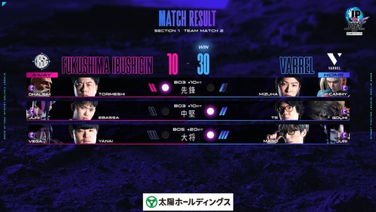 大将戦、「受けた恩を返したい」という「ヤナイ選手」に対し「壁の高さを見せる」と「マゴ選手」が立ちはだかる。9月初週の開幕戦、「セプテンバーマゴ」の異名通り、流石の仕上がりを見せた「マゴ選手」がストレートで勝利。10-30で「VARREL」が勝利した。