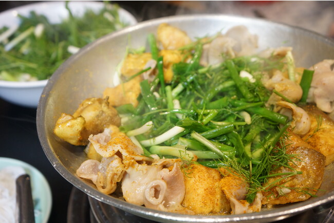 ハノイ名物のひとつチャーカー。ターメリックなどに漬け込んだ白身魚を、たっぷりのネギとディルで揚げ焼きに。専門店があるほど人気です。