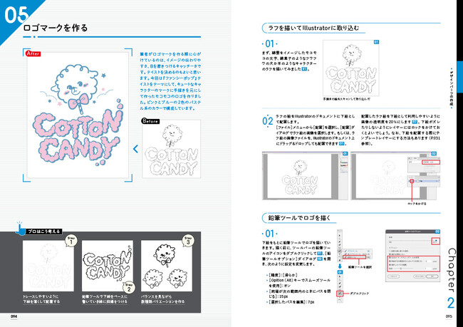 Chapter2は実際にプロがデザインパーツをIllustratorでどのように作成しているかをステップバイステップ形式で紹介。