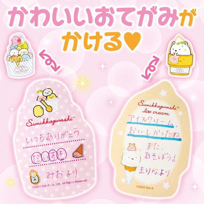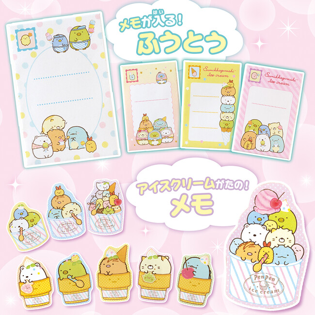 他にもかわいいアイテムがいっぱい! メモが入るふうとうは4枚で、すべて異なるデザインです。アイスクリームがたのメモは満足の12枚。裏側もこだわりのデザインになっています。アイスになりきるすみっコたちがとってもキュート!