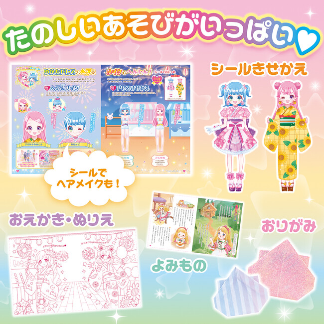 おえかきひめは付録だけではなく、本誌も超豪華。ヘア&メイクのおしゃれが楽しめる「ゆかたドレスとヘア&メイクでへんしん! シールでおしゃれ」、プリンセスたちとおえかきやぬりえがたのしめる「おえかき&ぬりえレッスン」、イラストがたっぷりで楽しいよみもの、ぬりえでおしゃれを楽しめちゃう「ぬりえでメイクアップ! メイク&ネイルでおしゃれしよう♪」、メッセージを書いて渡すと楽しい「かいがらのおりがみレター」など、楽しい記事が盛りだくさんです。