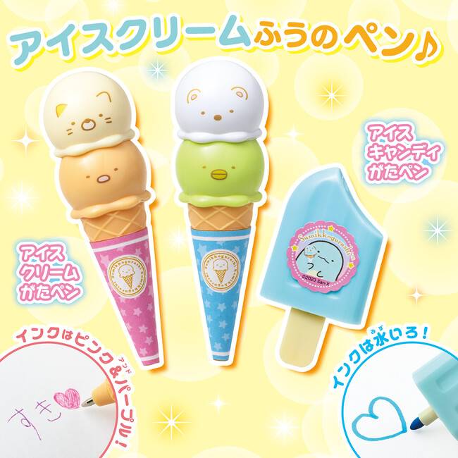 大注目はアイスクリームのようなペン。2段がさねのアイスの形がかわいいアイスクリームがたペンは、しろくま&ぺんぎん?ふう、とんかつ&ねこふうの2本セットです。コーンにまきがみを付けると、かわいさアップ! ソーダのようなさわやかな水いろのアイスキャンディがたペンには、しろくま、ぺんぎん?、とんかつ、ねこ、とかげ、ぺんぎん(本物)の6キャラクターから好きなシールを貼ることができます。