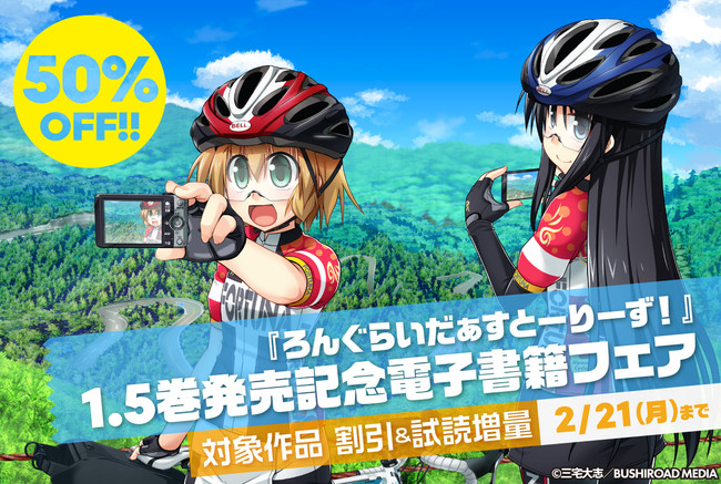 株式会社ブシロード(本社:東京都中野区、代表取締役社長:橋本義賢、以下ブシロード)のグループ会社にあたる株式会社ブシロードメディア(本社:東京都中野区、代表取締役社長:成田耕祐)は、本日2月8日(火)より「『ろんぐらいだぁすとーりーず!』1.5巻発売記念 電子書籍フェア」が各電子書店にて開始したことをご案内致します。自転車のロングライドや輪行旅などを題材にした『ろんぐらいだぁすとーりーず!』は現在、「月刊ブシロード」にて連載中です。本日『ろんぐらいだぁすとーりーず!』1.5巻・『ろんぐらいだぁすとーりーず!』1.5巻特装版が発売することを記念して、歴代シリーズがお得に読めるフェアを開催いたします。この機会にぜひご覧ください。皆様におかれましては是非誌面・Web記事等で本内容をお取り扱いいただければ幸いに存じます。