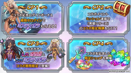 『黒獣シリーズ』とのコラボを記念したログインボーナスを開催中!ガチャやスタミナ回復などに使える「竜神石」が最大3,000個にくわえ、今ならコラボ期間限定キャラの「【SR】ミスティオラ」がもらえます!毎日ログインして「竜神石」と限定キャラを手に入れよう!