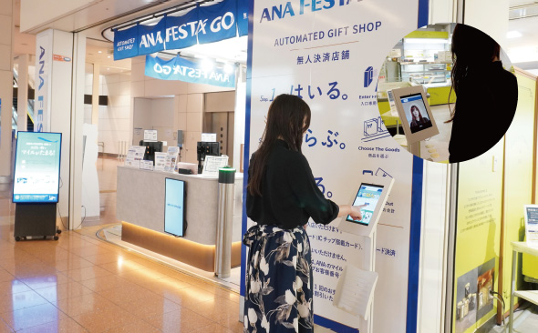 2023年2月に協業を発表してから第一弾の取り組みとして、ANA Digital Gate株式会社、全日空商事株式会社、ANA FESTA株式会社(以下、ANA FESTA)、日立の4社が2023年3月29日から行っている、ANA FESTAの店舗来店時の顔認証でマイルが貯まる「顔認証スタンプラリー」の実証実験において、パナソニック コネクトの顔認証技術が活用されています。