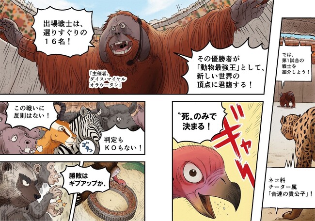シリーズ累計380万部を突破した人気シミュレーションバトル図鑑「最強王図鑑」シリーズ。「動物界や恐竜界など、各種属の猛者たちをトーナメント方式で戦わせ、最強を決めてしまおう」というコンセプトで作られた本シリーズが、このたびオリジナルストーリーのマンガになって新登場!