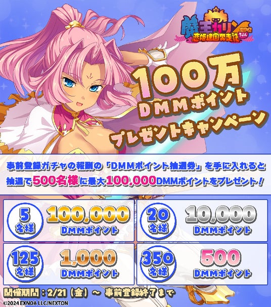 事前登録ガチャの個人回転数報酬に、総額100万DMMポイントが抽選で当たる
