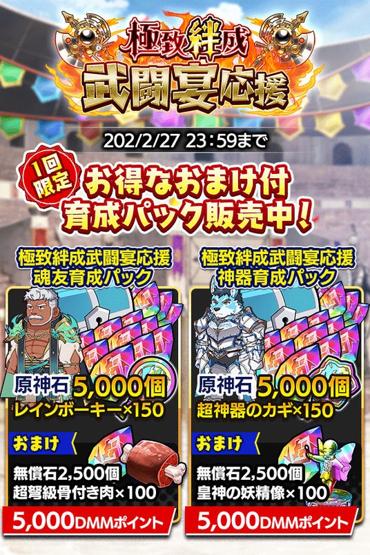 さらに、レインボーキーや超神器のカギがセットになった「極致絆成武闘宴応援育成パック」も2種登場!期間限定のこの機会をお見逃しなく。