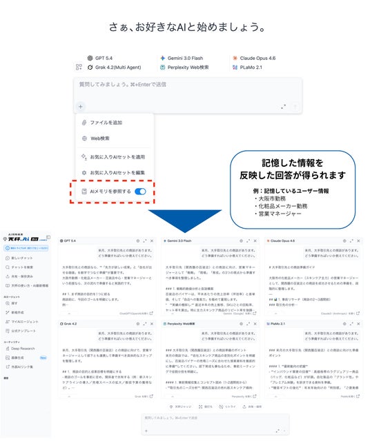 過去の会話をもとにAIが利用者の好みや仕事のスタイル、文章の書き方などを自動で記憶・活用します。次回以降の会話に自動で反映されるため、毎回同じ説明を繰り返す手間がなくなります。