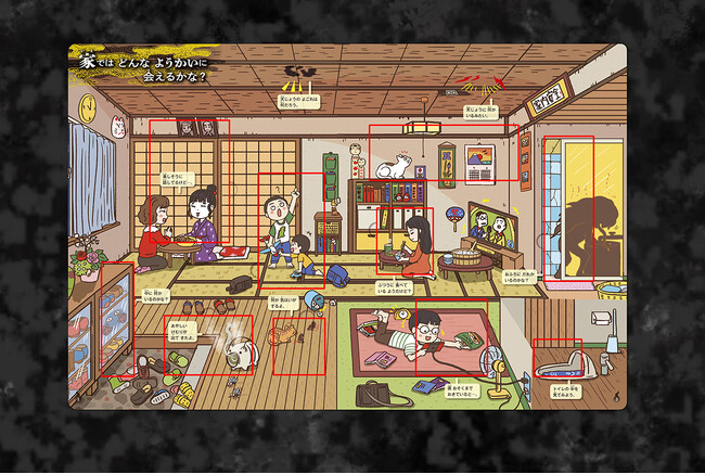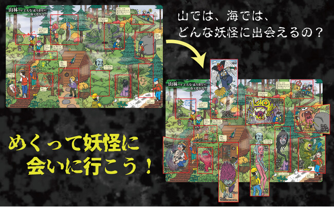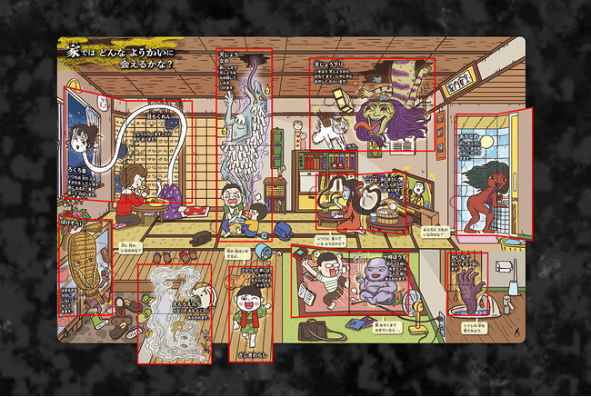 この本は、家や夜道、山、川、外国などの場所ごとに、全141種の妖怪たちと仲良くなれる本格図鑑。しかけをめくって、何もないところから妖怪をはっけんできるワクワクのしかけページと、妖怪たちの大きさや特徴、発見されたとされる地域などが詳しくわかる図鑑ページでできています。