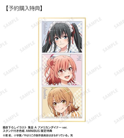 AMNIBUS STOREで開催された「『やはり俺の青春ラブコメはまちがっている。完』 POP UP SHOP in AMNIBUS STORE」描き下ろしイラストのアメリカンダイナー風の衣装の雪ノ下雪乃、由比ヶ浜結衣、一色いろはをメインにデザインしました。