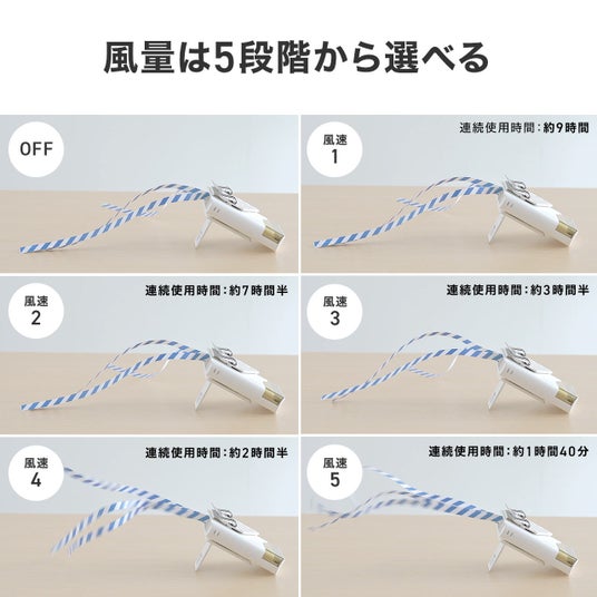 5段階の風量調整が可能で、シーンに合わせて最適な風を選べます。