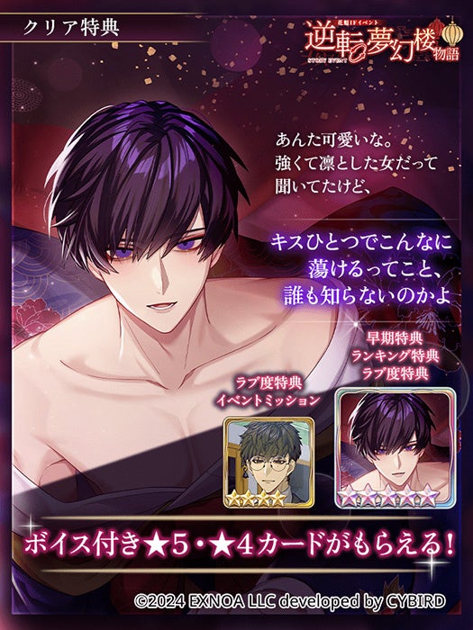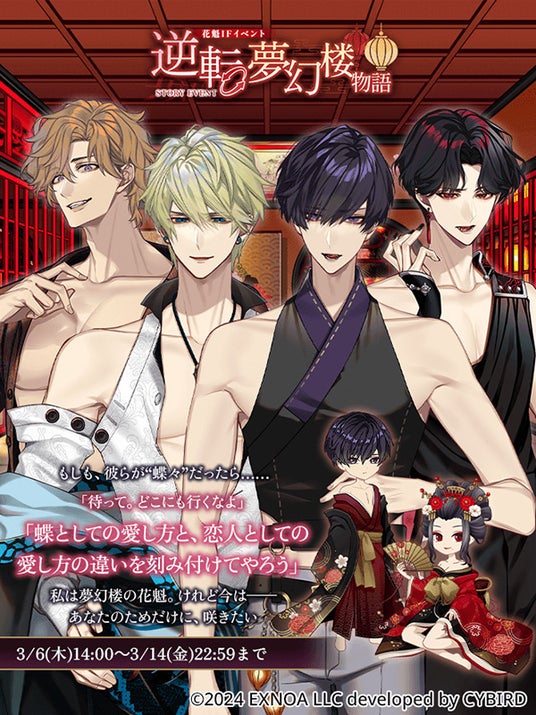 DMM GAMESを運営する合同会社EXNOA(本社:東京都港区、CEO:村中 悠介、URL:https://games.dmm.com/)は、オトナの女性向け恋愛ゲーム「夢幻楼と眠れぬ蝶」にて、★4確定ガチャチケットなどのゲーム内アイテムをプレゼントするキャンペーンの実施をお知らせいたします。また、新たなゲーム内イベントとガチャの開催と、ゲーム内イベントと連動したXキャンペーンの実施もお知らせいたします。