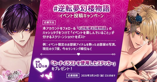 公式X(@roman_mugenro)をフォロー&ハッシュタグ「#逆転夢幻楼物語」をつけて、イベントに関するスクリーンショットをポストいただいた方の中から抽選で10名様に「カードイラストを使用したステッカー」をプレゼントいたします。