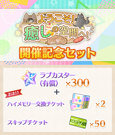 ラブカスター×300に加えて、「スキップチケット」×50、「ハイメモリー交換チケット」×2付きのセットとなっております。