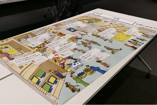 後ろのテーブルに置いてあるのは、『世界が広がる学問図鑑』から作成した、5枚の「学問図鑑特大ポスター」。それぞれのポスターには、「お金ってどうやって生まれたの?」「食べ物は昔と比べてどう変わってきたの?」など、8つの問いが載っています。
