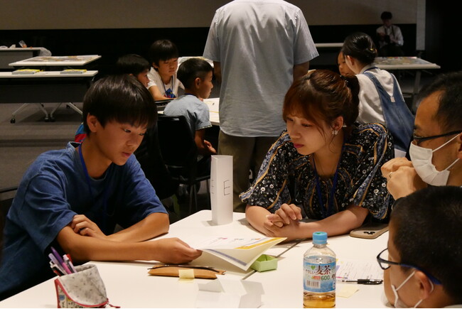 最後に、自分が気になった4つの「問い」について、スタッフに質問しに行きます。今回は、若手研究者や社会人など、さまざまな専門性をもつスタッフ10名が参加しました。スタッフがすべての「問い」について答えを知っているわけではありませんが、意欲的な子どもたちとの対話により「問い」を一緒に深めていく場となりました。
