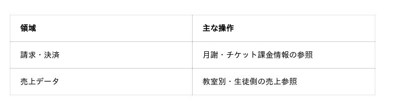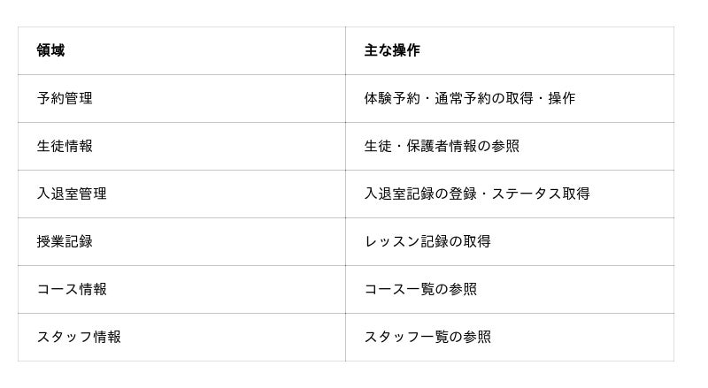 本APIにより、スクールの予約・生徒・売上といった運営データを、外部システムやAIツールから直接取得・操作することが可能となります。これにより、退会予兆などAIによるデータ分析や会計処理などの業務自動化が実現し、スクール運営の業務効率化を支援します。