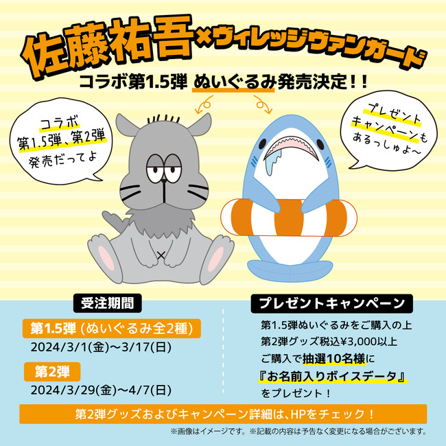 ヴィレッジヴァンガードオンラインストアにて、「第1.5弾ぬいぐるみ」+「第2弾グッズを税込¥3,000以上」をご購入いただいた方の中から、抽選で10名様に『お名前入りボイスデータ』をプレゼント!
