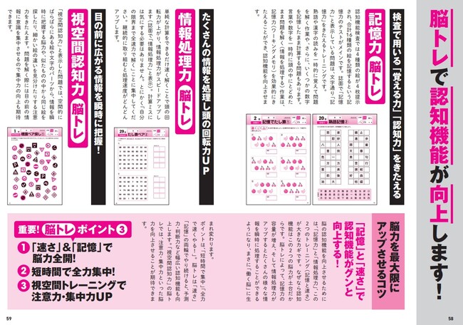 本書内のドリルでは、認知機能検査合格のために必要な脳力である「記憶力」「情報処理」「視空間認知」の3つの脳力を向上させます。各問題には「記憶力」などの各アイコンがあり、問題の効能がすぐにわかるので安心して取り組めます。しかし検査対策と言っても難しく考える必要は全くありません。本書の対策ドリルは、大人の方が楽しんで取り組める絵や文字、数字のパズルですから、気楽にパズルで遊びながら合格対策ができるのです。最新のエビデンスに基づいた認知機能検査対策本は本書だけ! 認知機能検査対策には本書がベストです!