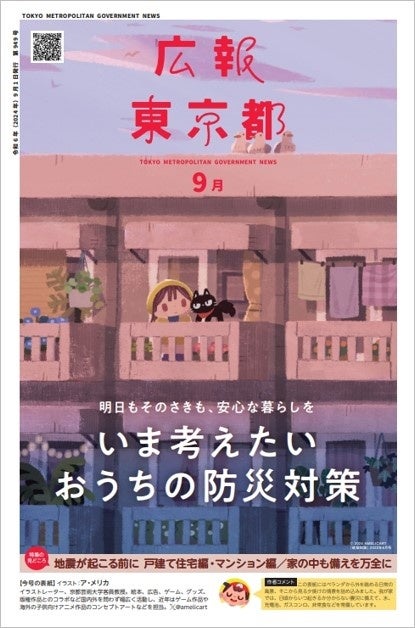 9月号のコラボレーションは、イラストレーターのア・メリカさん。建築月刊誌「建築知識」2022年6月号のイラストを広報東京都で使用させていただきました。ベランダから外を眺める日常の風景とそこから見る夕焼けの情景。どことなく秋を感じさせる色合いや、あたたかみのあるイラストが、平穏な日常のありがたさを思わせてくれると同時に、日常を守るための防災対策の大切さにも気づかせてくれます。