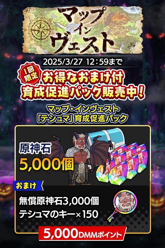 「テシュマ」登場を記念して、原神石に加え、育成素材が入手できてお得な「マップ・インヴェスト「テシュマ」育成促進パック」が登場!こちらも是非お見逃しなく!