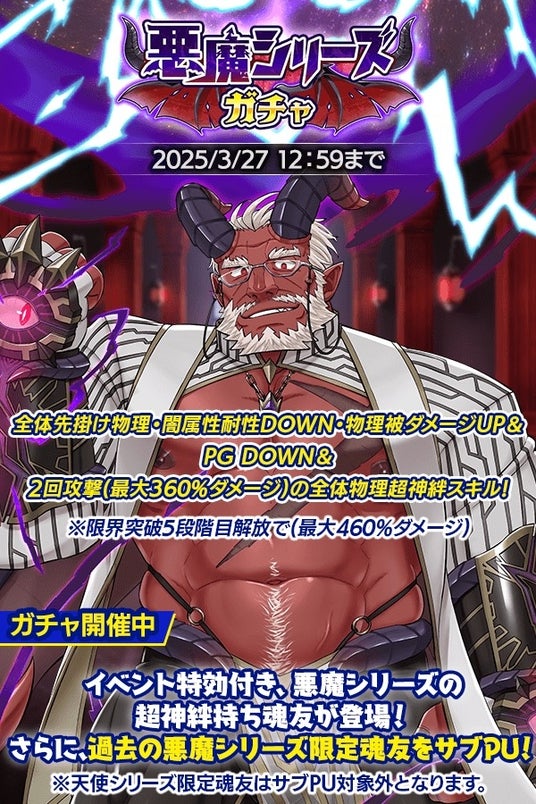 本ガチャでは、過去の天使・悪魔シリーズガチャに登場した「ゴルード」「セルバート」「アイシュエル」「ダンタリオン」「フォカロル」「ヴァレフォル」「ニトハイヤ・グラシャラ」「ミズィヴエル」「ゼギドエル」も入手可能です。いずれも神絆ゲージ上限突破スキルを持つ強力な魂友なのでお見逃しなく!