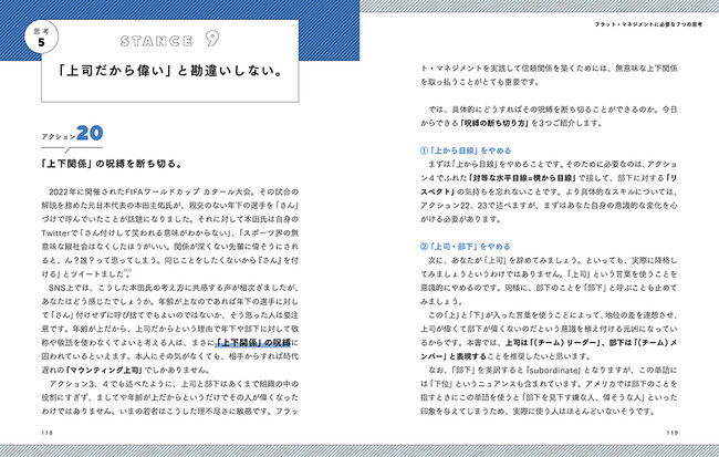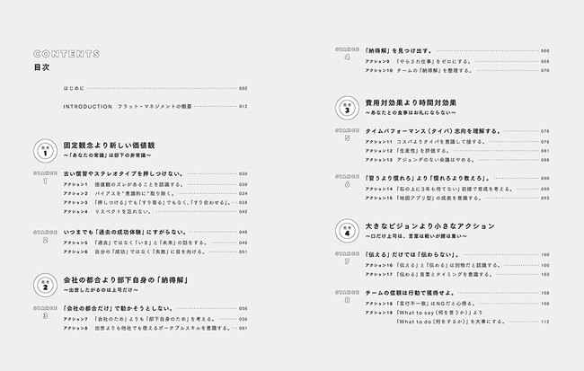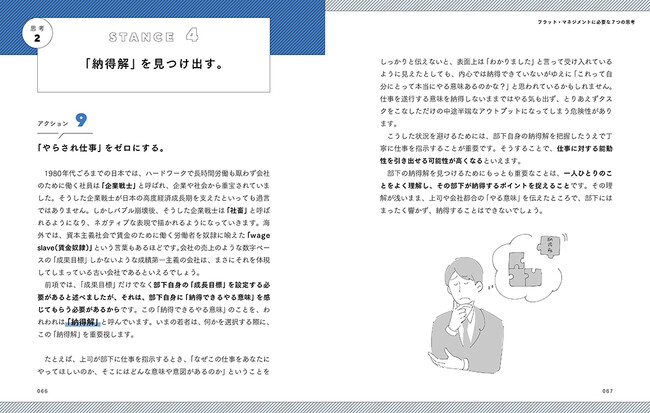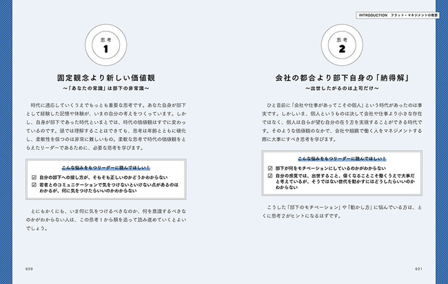 本書では、「杓子定規な考え方にとらわれず、チームメンバーの一人一人と向き合いながら、その多様性を生かしてチームをより良い形に整えていく「フラット・マネジメント思考」」を提唱し、変わりゆく時代における課題について、直接的に現場の指揮を執るリーダーに焦点を当てていきます。