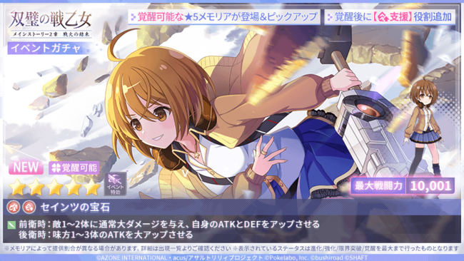 イベント「双璧の戦乙女」での一場面を描いた★5メモリア「暴君の花嫁」「劔の妖精」「セインツの宝石」の3枚が初登場する、「メインストーリー2章 戦火の結束『双璧の戦乙女』イベントガチャ」を開催します。