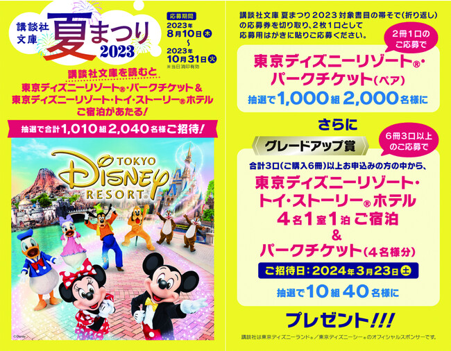 株式会社講談社(本社:東京都文京区)は、『講談社文庫夏祭り2023』と題したフェアを全国のフェア参加書店にて開催いたします。 本フェアは、東京ディズニーリゾート(R)や、東京ディズニーリゾート・トイ・ストーリー(R)ホテルへのご招待など、講談社ならではの特典が満載です。