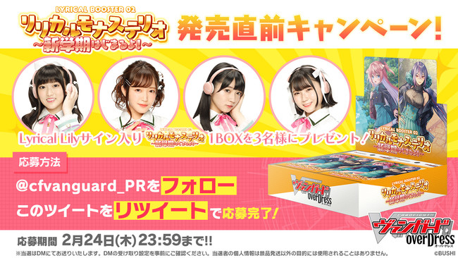 カードファイト!! ヴァンガード overDress リリカルブースター第2弾「リリカルモナステリオ ~新学期はじまるよ!~」 発売直前を記念して、Lyrical Lily直筆サイン入りBOXを抽選で3名様にプレゼントする『リリカルブースター第2弾「リリカルモナステリオ ~新学期はじまるよ!~」発売直前キャンペーン」を実施いたします。