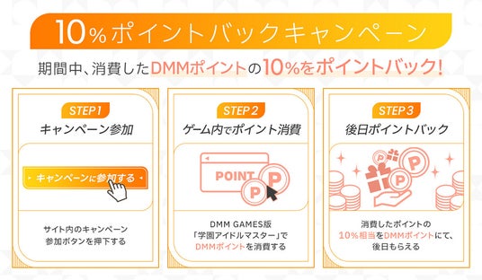 期間中に、キャンペーン特設サイトからキャンペーンへ参加し、DMM GAMES版『学園アイドルマスター』で、DMMポイントを消費いただいたユーザー様を対象に、消費ポイントの10%を後日DMMポイントにて還元します。
