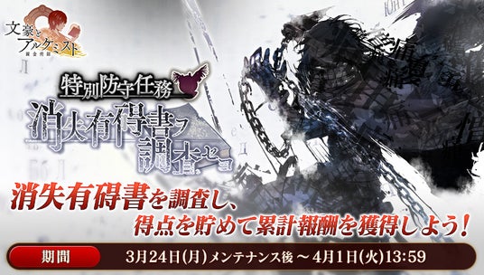 イベント『特別防守任務「消失有碍書ヲ調査セヨ」』を開始いたしました。本イベントは、イベント限定のステージに潜書して、得点を集める事が目的です。集めた得点の総獲得数が一定の値に達すると、アイテムを獲得することができます。