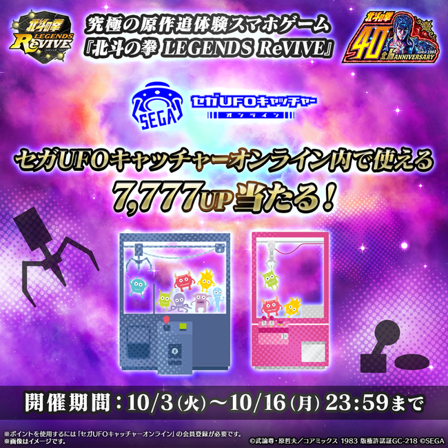 『北斗の拳』40周年&「北斗リバイブ」4周年記念大感謝キャンペーン第四弾を開催! 「北斗リバイブ」公式アカウントと「セガUFOキャッチャーオンライン」公式アカウントをフォローのうえ、対象投稿をリポストした方から抽選で、「セガUFOキャッチャーオンライン」で使える7,777UP(1UP=1円相当)を10名様にプレゼントします。奮ってご参加ください!