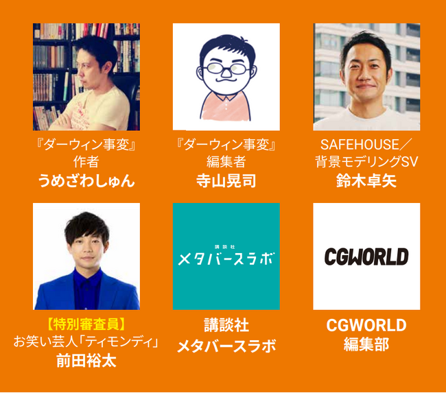 このコンテストの注目すべき点は、マンガをテーマにしたCGコンテストであることと、審査員のラインナップ。『ダーウィン事変』作者のうめざわしゅんさん、『ダーウィン事変』編集者の寺山晃司さん、SAFEHOUSE/背景モデリングSVの鈴木卓矢さん、CGWORLD編集部、講談社メタバースラボ、そして特別審査員・お笑い芸人のティモンディ前田裕太さんの、計4名と2団体が審査を行いました。