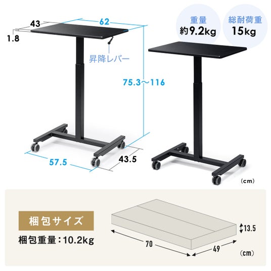 スタンディングデスク コンパクト ガス圧昇降 幅62cm 奥行43cm 高さ76~110cm キャスター付き 腰痛軽減 座りすぎ防止